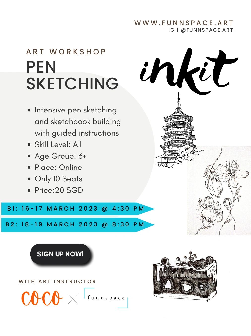 Learn intensive pen sketching sketchbook building with full flegeded guided instruction with our very funn and lovely art instructor Coco!